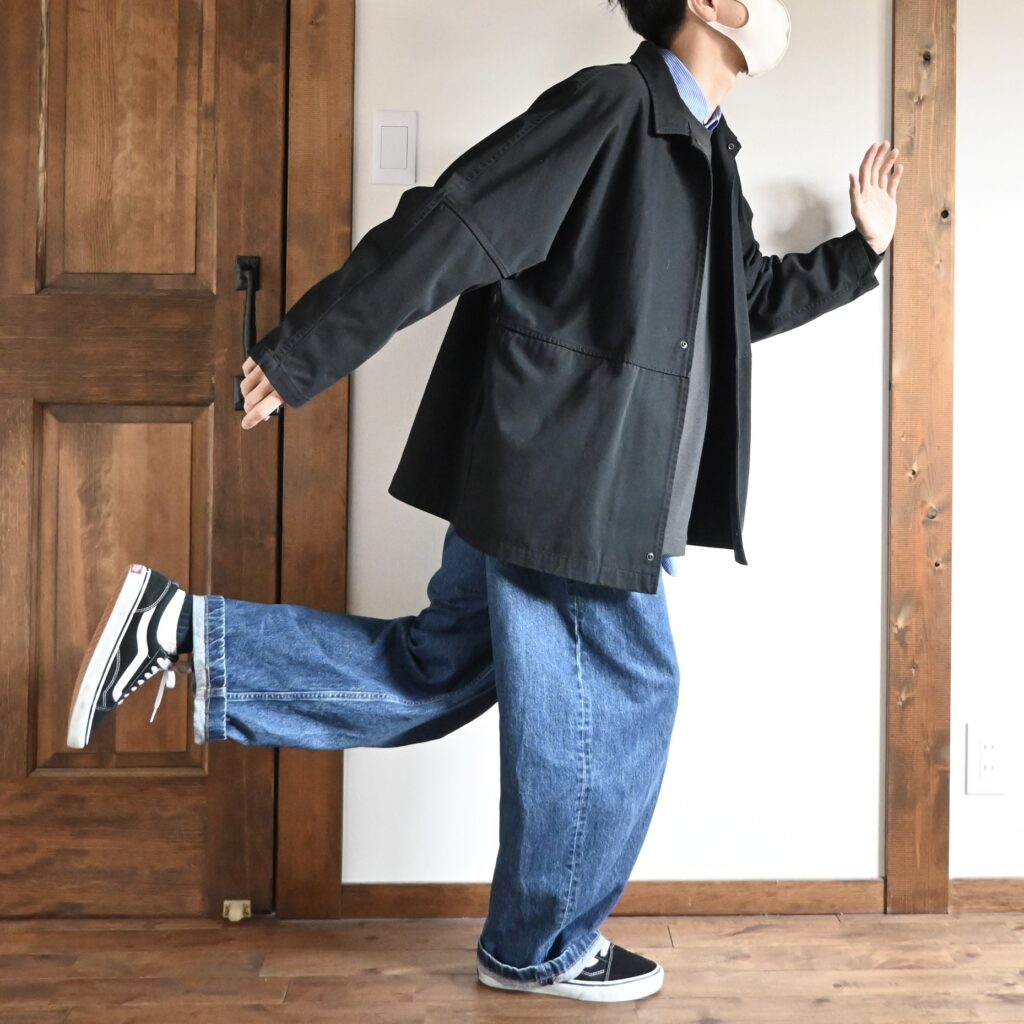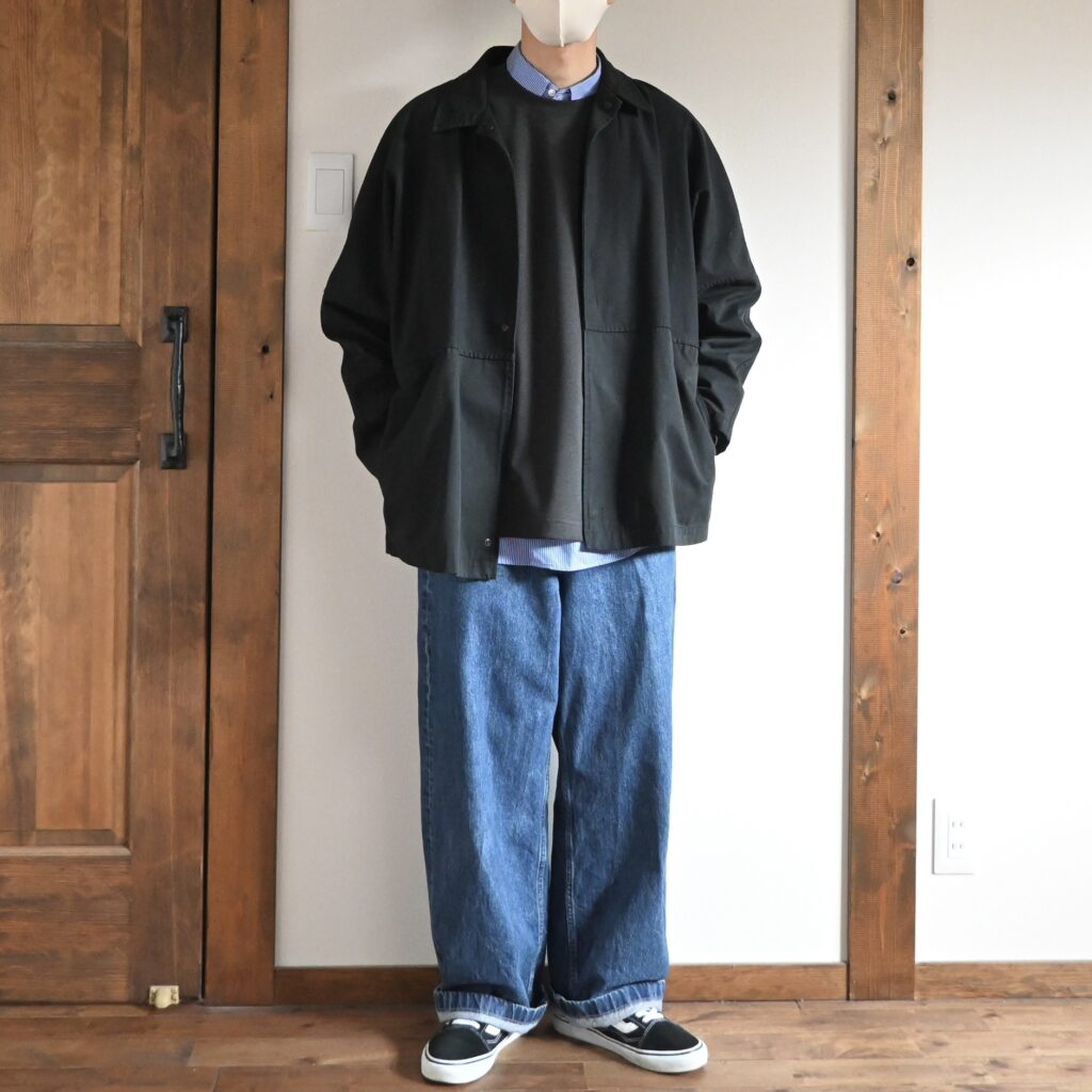 ブルーのシャツを下に入れると結構相性が良いなと感じたので、今度はワイドシルエットのブルージーンズを合わせてカジュアルめにコーデしてみました。