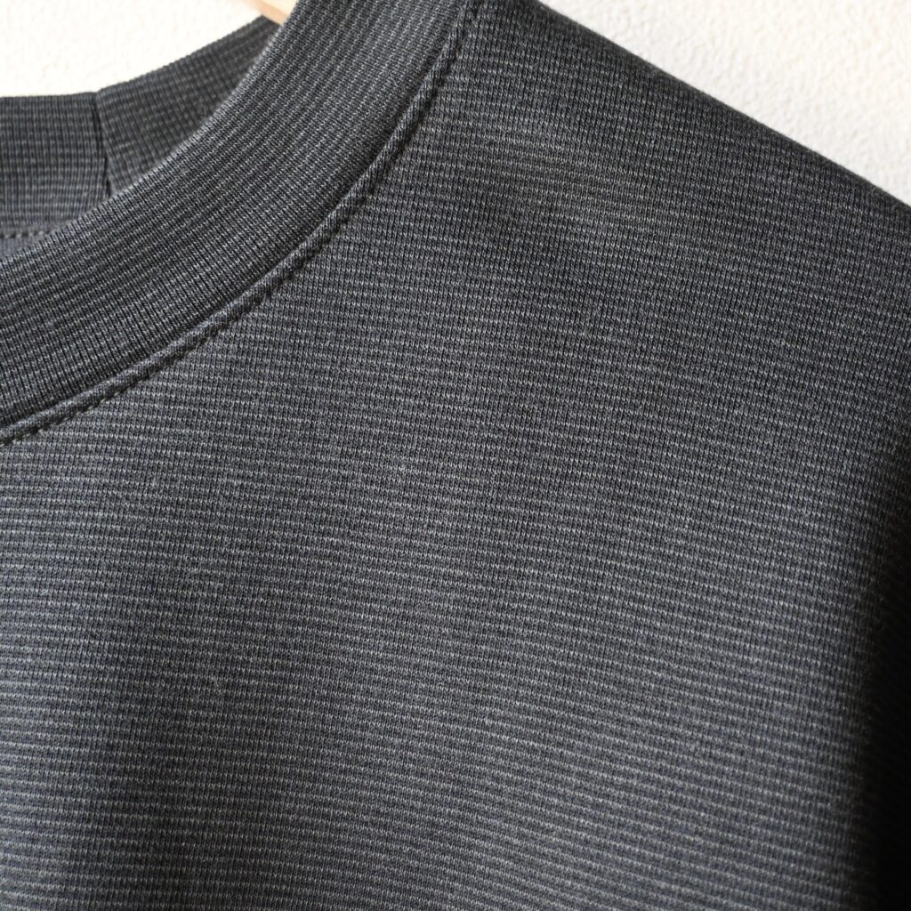 首周りはしっかり詰まったデザインなので、ゆったりめなサイズ感ではあるんですがしっかり清潔感も漂うクリーンなアイテムに仕上がっています。