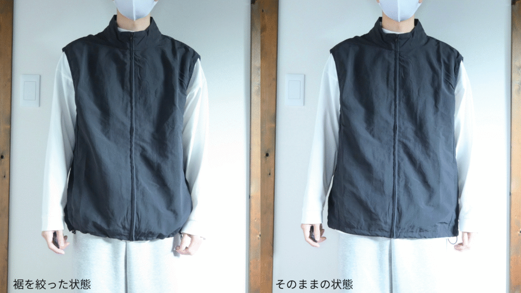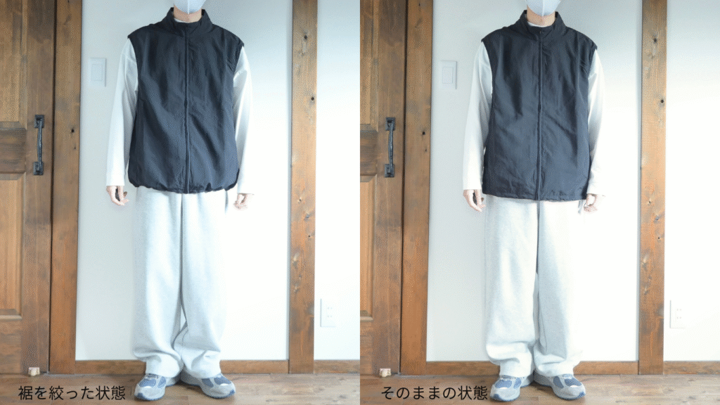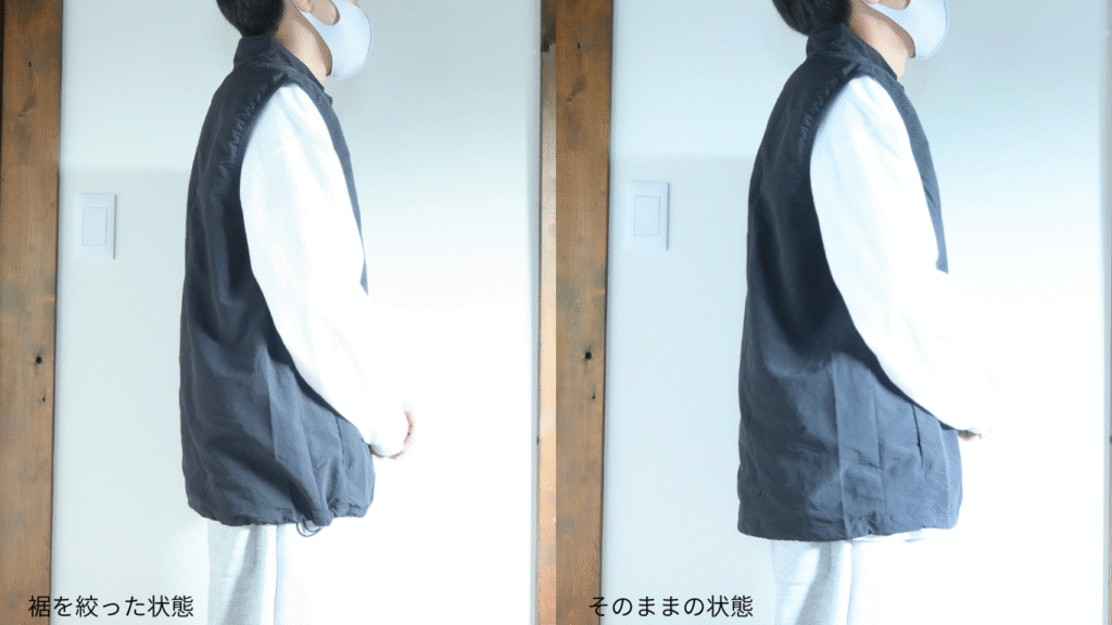 とも思ったんですが、こちらのベストは裾を絞って着ることも出来るので