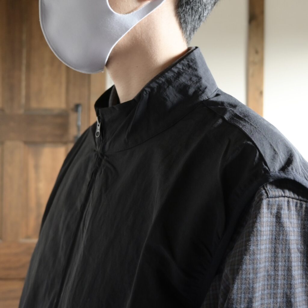 この手のベストは首元までしっかりと隠れるデザインのものが多いんですが、こちらのベストはレギュラーカラーシャツの襟の高さのように首の真ん中あたりの高さなので、見た目もスッキリで非常にお洒落だと感じました。ハイネックのTシャツやレギュラーカラーシャツを合わせた時に、首周りからチラッと見えるかどうかの微妙な長さなのが良いですね。