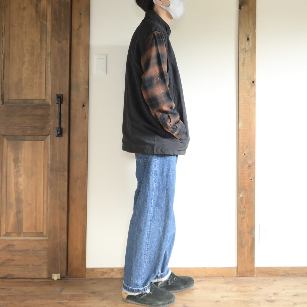 店頭でMサイズも試着したんですが、Tシャツなど薄手なトップスの上から着るのであれば、Mサイズでも充分かなと感じました。ただ、これからの季節はスウェットやパーカーなど厚手でオーバーサイズなアイテムの上から着ることが増えるなと思ったので、今回は敢えて1サイズUPのLサイズを選びました。