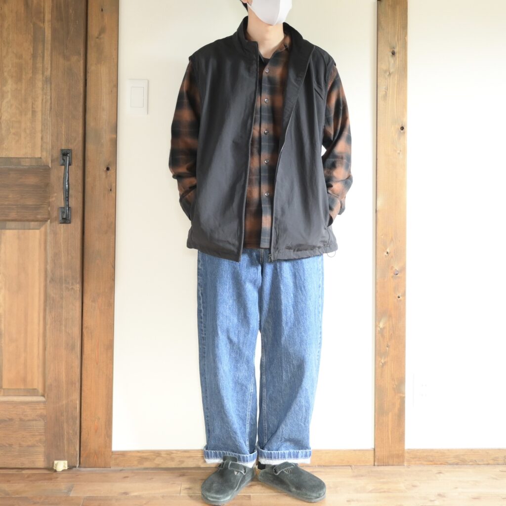 続いては同じくワークマンの『マイクロブラッシュシャツジャケット』という起毛感のあるシャツアウターに合わせてみました。