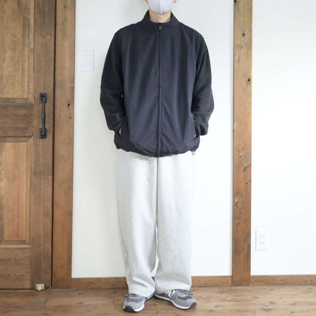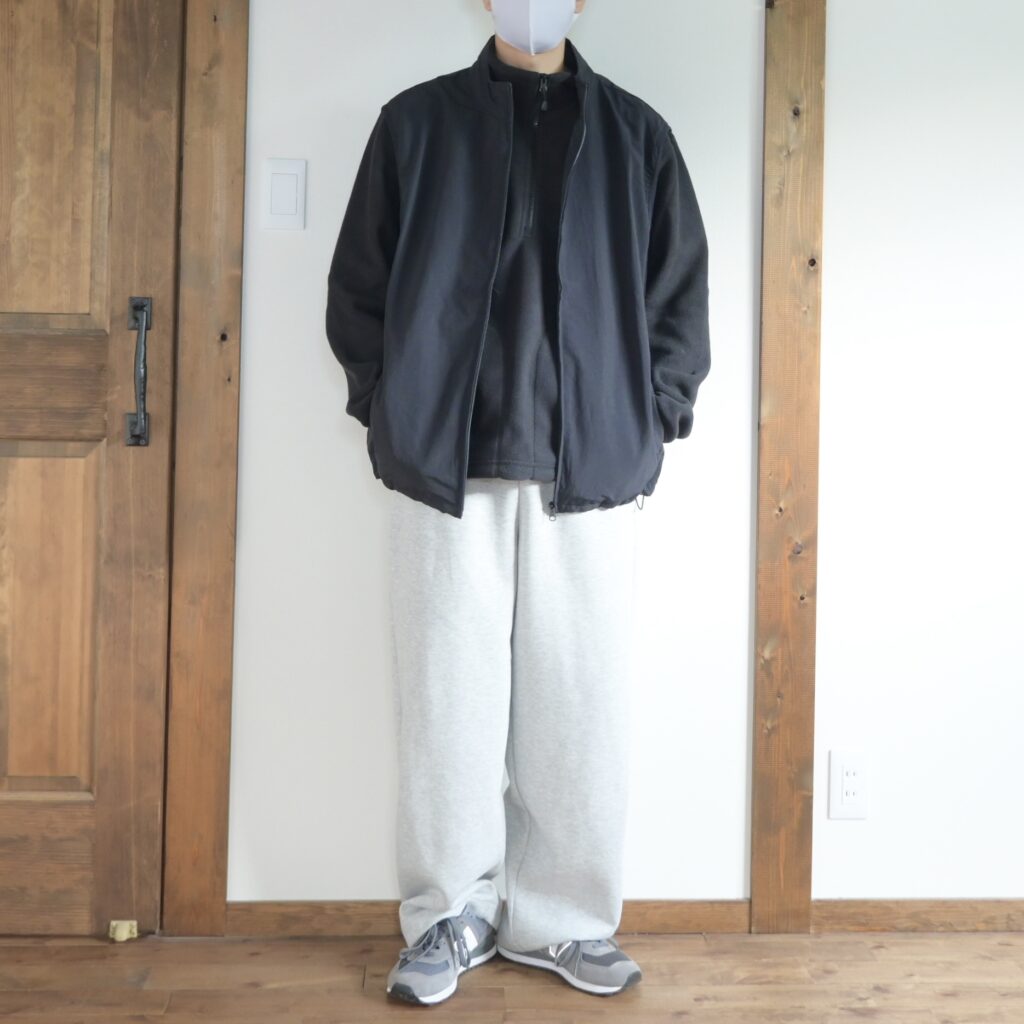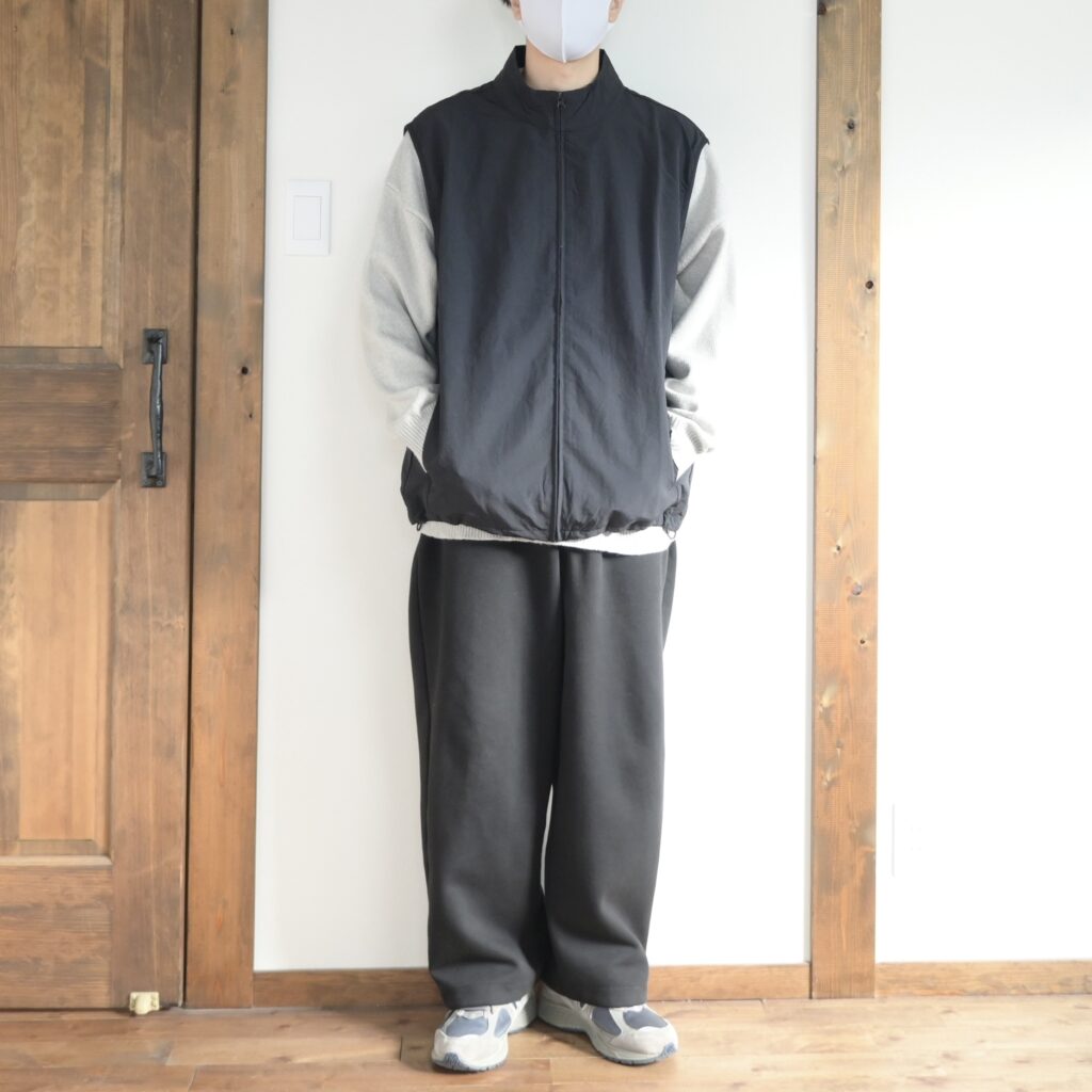 ネックの高さも控えめで生地も薄手なので、真冬になるとアウターの中に入れて使うのも良さそうですね。アウターは UNIQLOの『ウィンドプルーフスタンドブルゾン』ベストと同じテック系のアウターなので相性良いかなと思います。今回もグレー&ブラックでまとめてます。