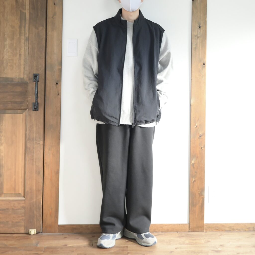このニットも身幅が広くてかなりゆったりとしたサイズ感なんですが、こんなオーバーサイズなニットやスウェットの上から着ても全く窮屈感がないので、コーデの幅がとても広いと思います。先ほどのコーデと同様に黒とグレーなど使う色を少なくまとめるとバランスがとりやすいかなと思います。