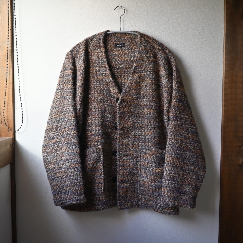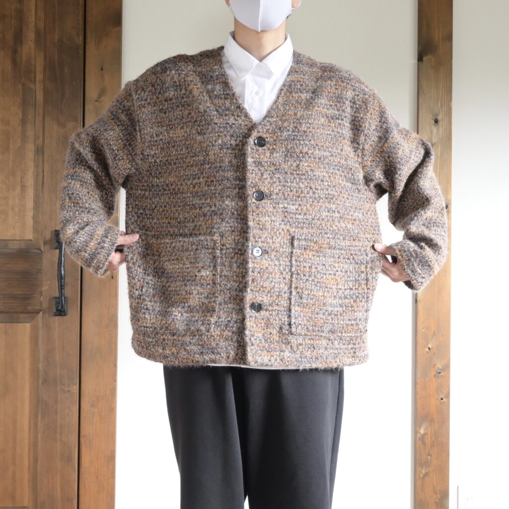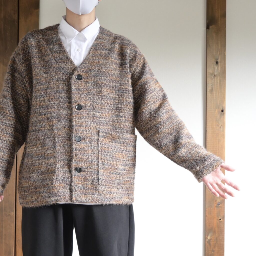ゆったりとしたオーバーサイズなカーディガンです。両サイドに付いている大きめなポケットもアクセントになって可愛いですね。混じり気のある曖昧な色味が古着っぽさを出して全体的に雰囲気があって良い感じです。