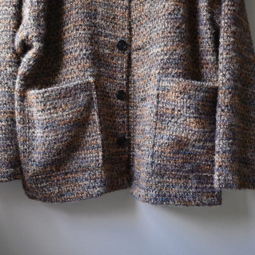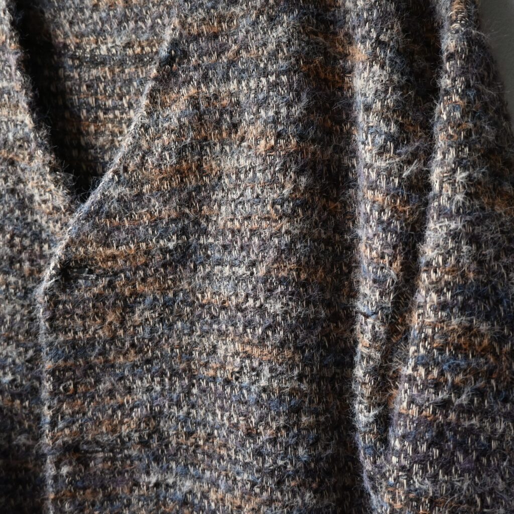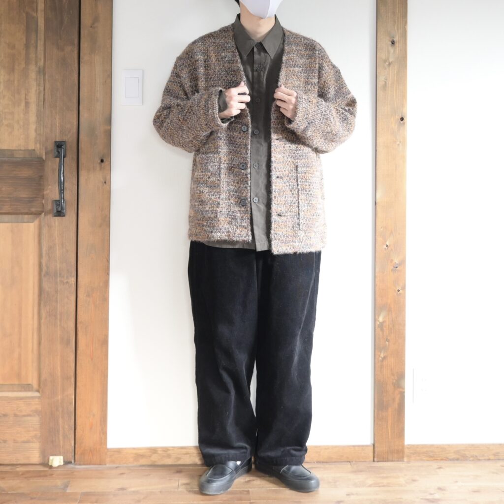 ワイドシルエットなんですが、着丈短めでスッキリとしたデザインなのでアウターとしてもインナーとしても使いやすいなと感じました。ポリエステル素材のツィードは、いろんな色が混じり合ったような古着のような特徴的な生地なので、古着ミックスやラフなコーデが好きな方に刺さるアイテムかなと感じましたし、シャツやジャケットといった綺麗めなコーデに混ぜて使っても面白いなと感じました。