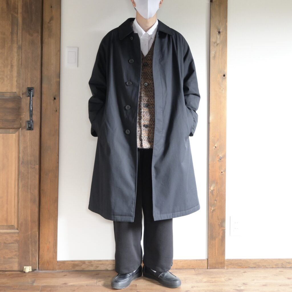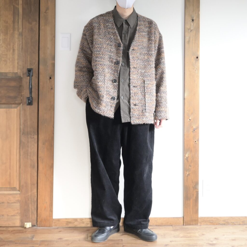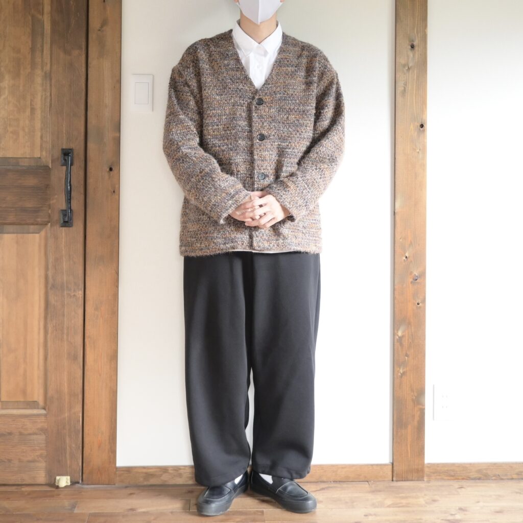 2つめのコーデよりももう少し綺麗めなコーデに寄せてみたんですが、襟付きシャツやコートといったきちんとしたアイテムに混ぜても意外と使いやすいなと感じました。ただ、身幅が広いオーバーサイズなカーディガンなので、スラックスのような綺麗めパンツと合わせるとアンバランスに感じました。今回のようなスウェットパンツの方が合わせやすく感じました。