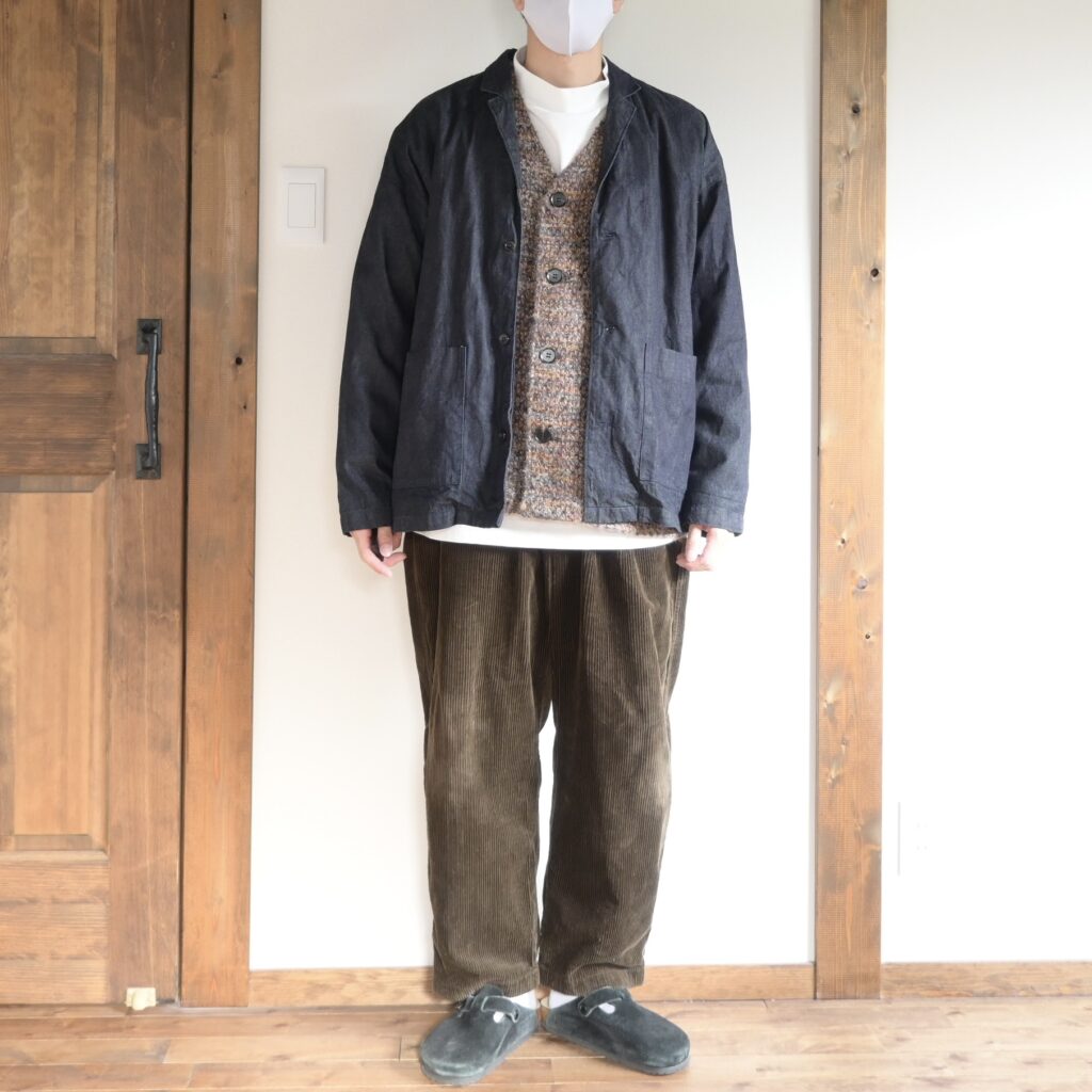 絨毯みたいな生地ですが、あまりチクチク感は感じなかったので、Tシャツの上から羽織っても問題ないかなと思います。これから本格的な秋になると羽織ものとして、冬になると前のボタンを閉めてミドルレイヤーとしても使えるアイテムだと思うので、そこは後でコーデしてみます。