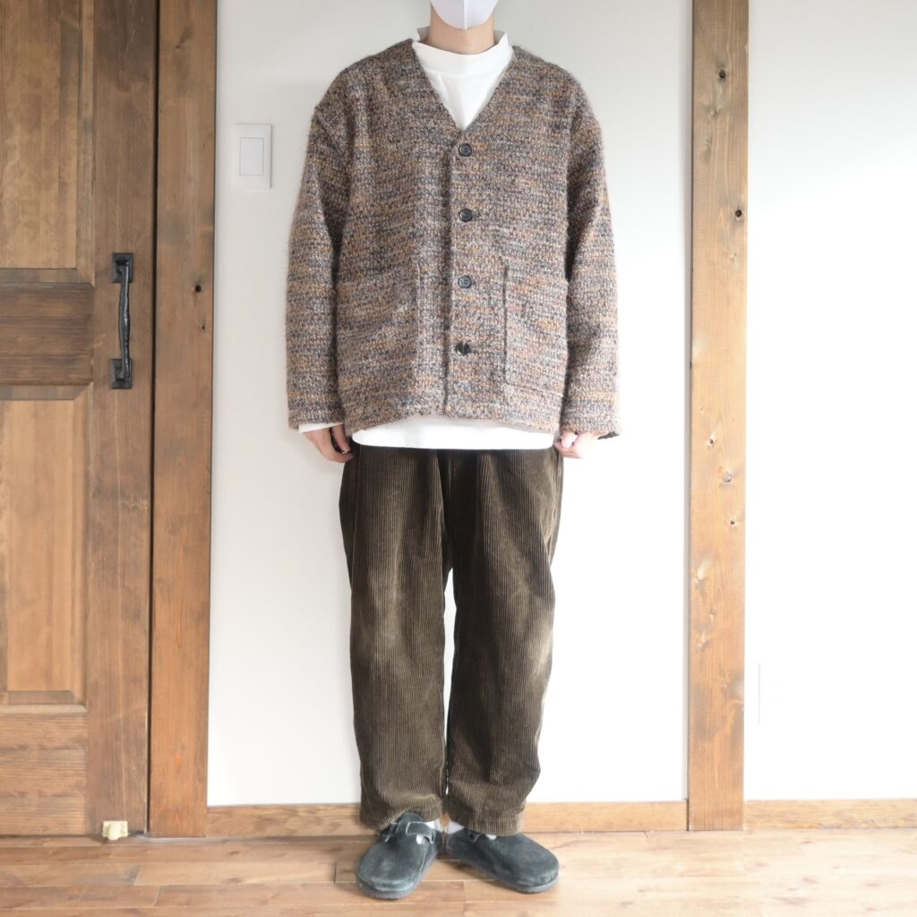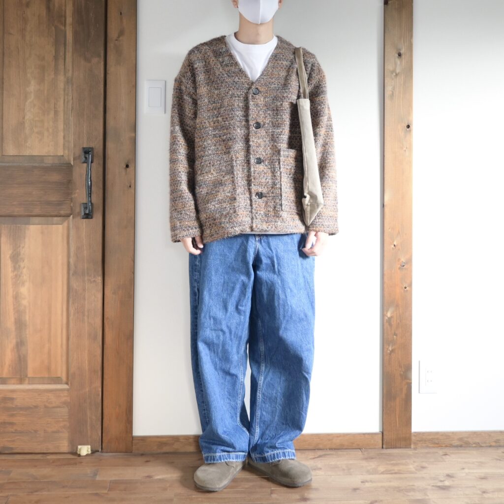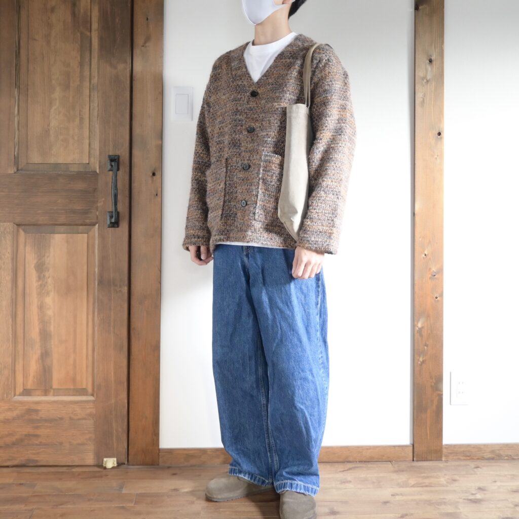 アウターはデニム生地のカバーオールで、パンツはコーデュロイのブラウンパンツ。THE秋という配色で合わせてみました。カーディガンとしてアウターとして使うのも良いですし、今回のように内側に入れて着るのも可愛いかなと思います。混じり気のあるブラウンが単調なコーデにアクセントカラーとし意外に良い味を出してくるので、冬コーデで取り入れるのも良いと思います。